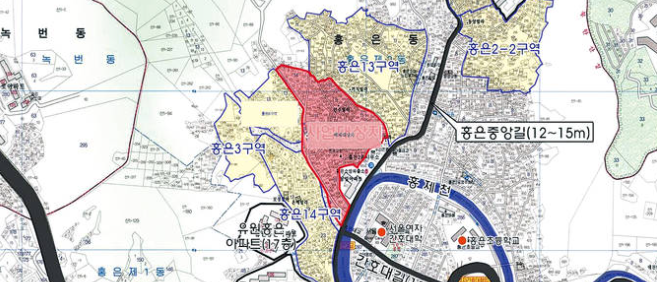 산자락을 타고 올라가면서 현재 두산 위브가 완공된 홍은 6구역 재거축, 14구역 재개발, 그리고 현재 펜스를 치고 현대산업개발이 시공할 예정인 대단지의 13주택재개발 지역이 있다.