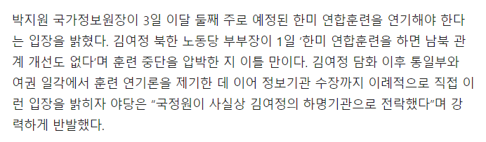 국정원장이라는 박지원놈은 적국 여자 한명이 한마디 했다고 홀랑 나라를 팔아먹고 군사훈련을 미룬다고?